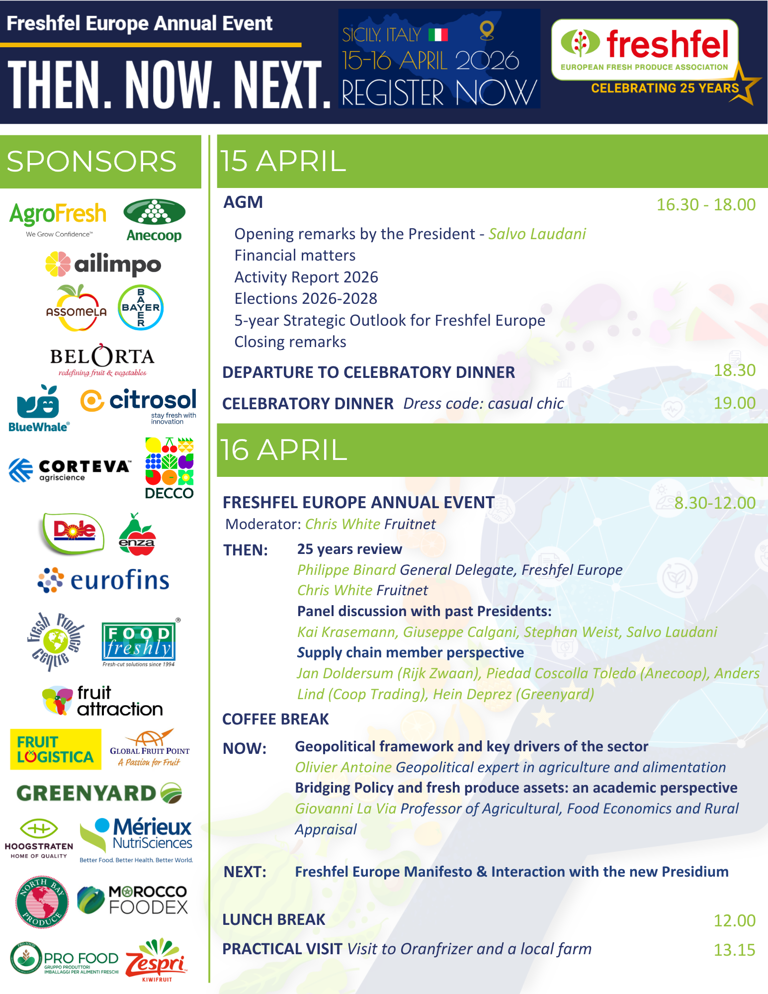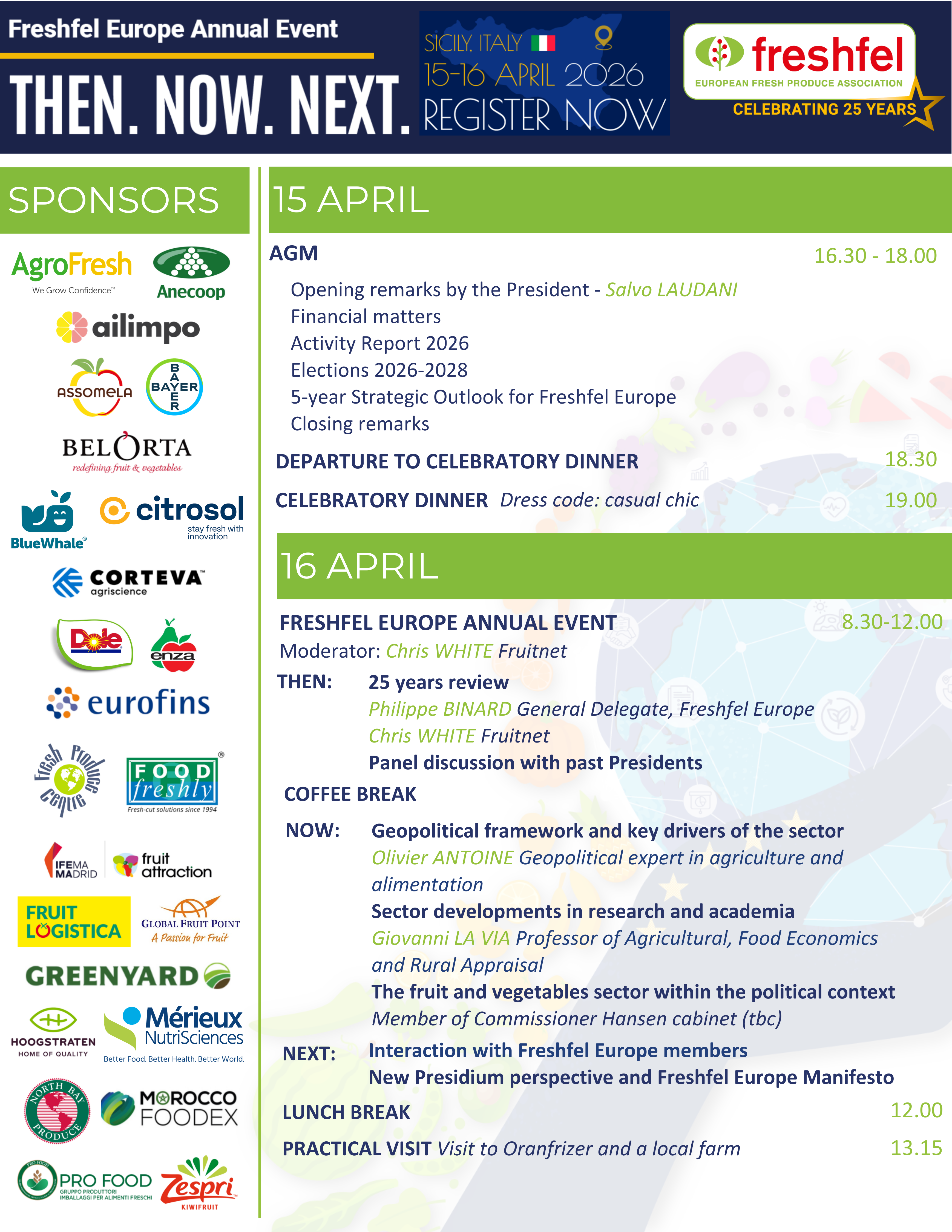 On 15-16 April 2026, Freshfel Europe will hold its Annual Event, where the entire fruit and vegetables sector will meet in Giardini Naxos (Sicily, Italy) to highlight the important contribution fruit and vegetables make towards healthy and sustainable diets and celebrate 25 years of Freshfel Europe activities. The event will identify the answers the sector holds to societal challenges, and discuss the political support needed to secure sustainable fruit and vegetable production.